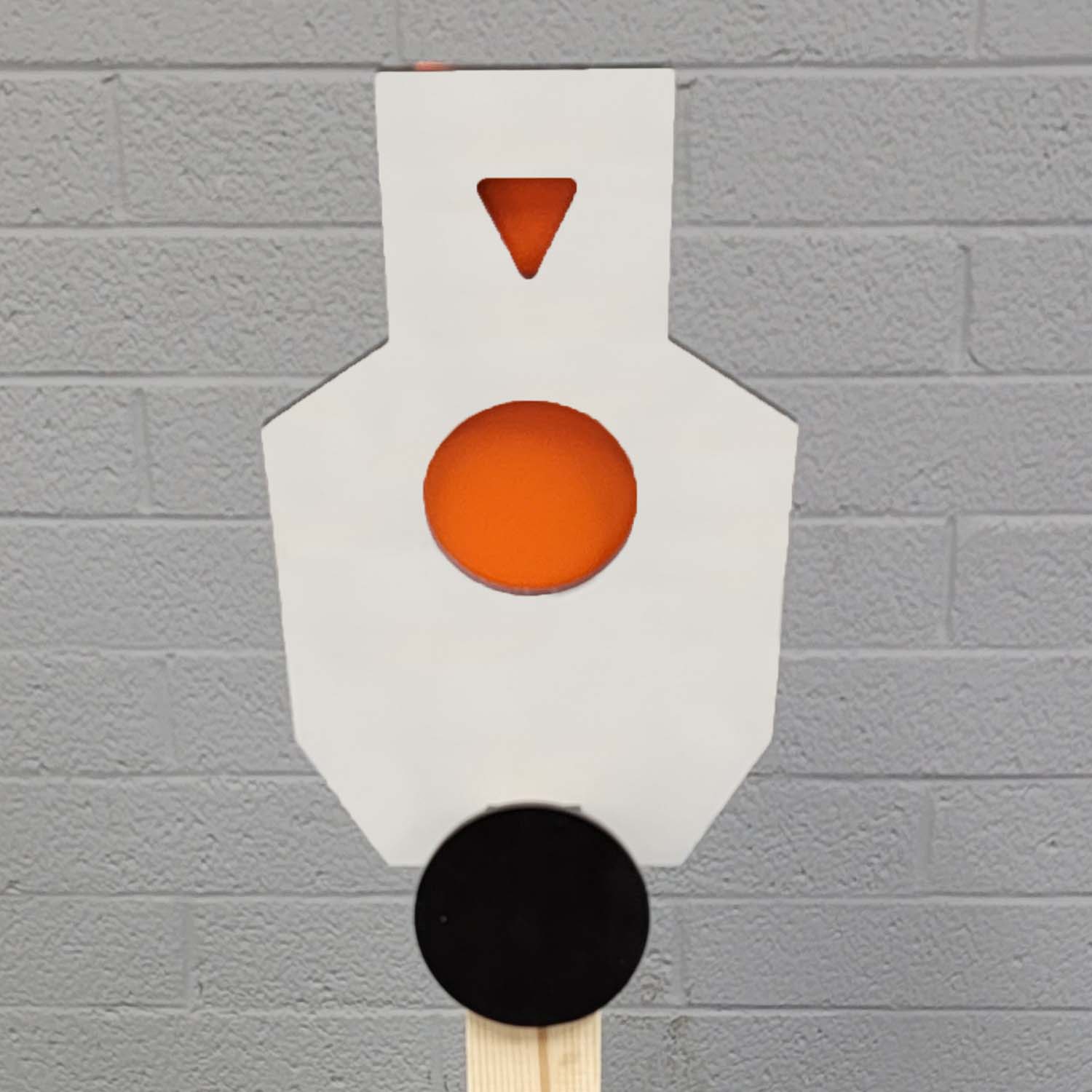 This is a solid 3/8″ AR500 silhouette with a tactical “eyes/nose” head-shot triangle for the master marksman, as well as a 6″ center mass paddle.  Ideal for rifle beyond 100 yards, or to test your limits with pistol at 10 yards and out.  Able to withstand thousands of pistol and rifle rounds.*