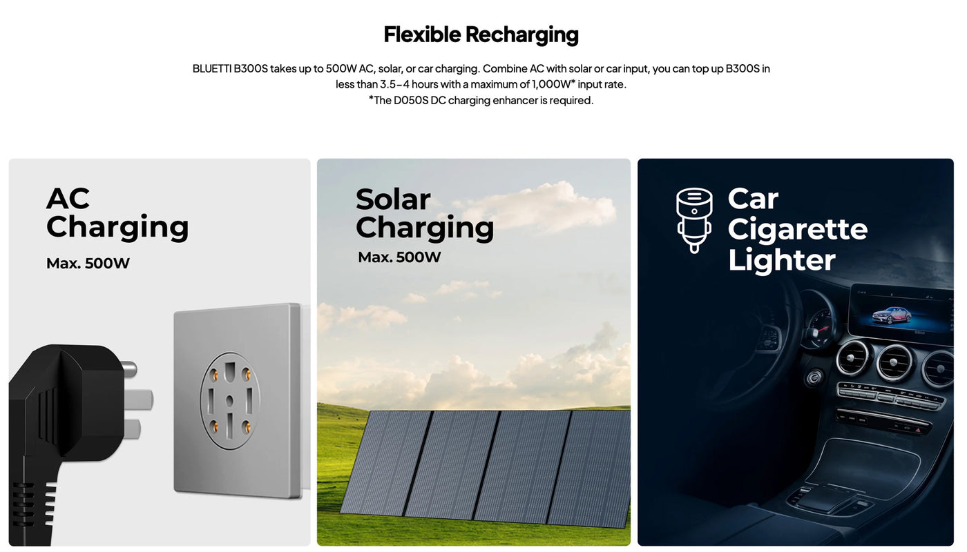 The B300S offers flexible recharging options to suit your needs. Whether you have access to AC power, solar panels, or a car power source, you can keep the B300S topped up with ease. Combine AC, solar, or car input, and you can achieve rapid recharging, with a maximum input rate of up to 1,000W* for a quick replenishment.
