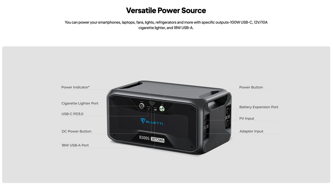 The B300S isn't just an expansion battery; it's a standalone power station in its own right. Equipped with versatile output options, including a 100W USB-C port, a 12V/10A car port, and an 18W USB-A port, this powerhouse can charge a wide range of devices, from smartphones and laptops to fans, lights, and even refrigerators.