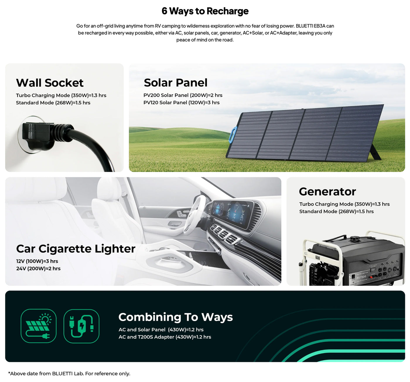 Whether you're off the grid in an RV or exploring the wilderness, the EB3A has you covered. It can be recharged via AC, solar panels, your car, a generator, AC+Solar, or AC+Adapter, ensuring you're never left powerless during your adventures.