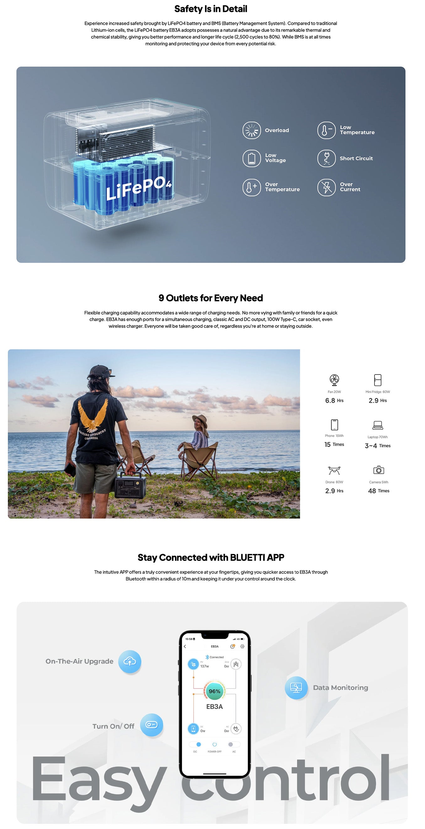 Safety is a top priority with the EB3A. Its LiFePO4 battery and Battery Management System (BMS) offer enhanced protection. The LiFePO4 battery provides superior thermal and chemical stability, resulting in better performance and a longer life cycle (up to 2,500 cycles to 80%). The BMS continuously monitors and safeguards your devices from potential risks.