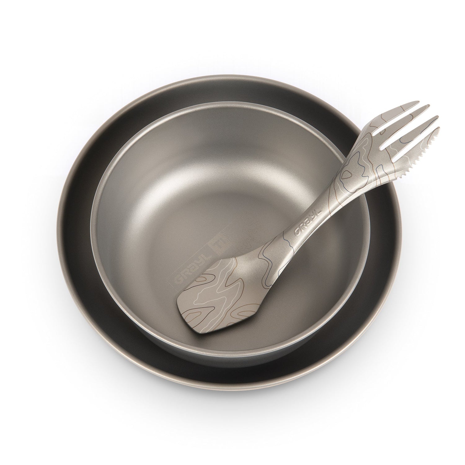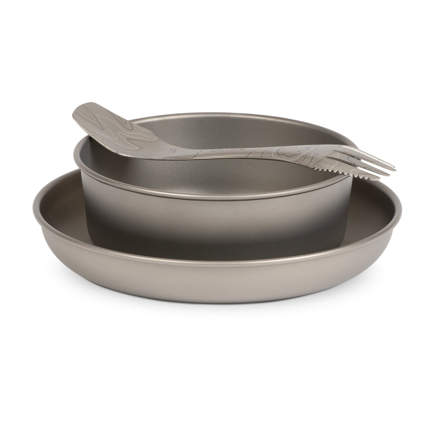 - Complete Titanium Set: Includes a deep dish plate, bowl, and a 3-in-1 spork combining spoon, fork, and serrated knife.
