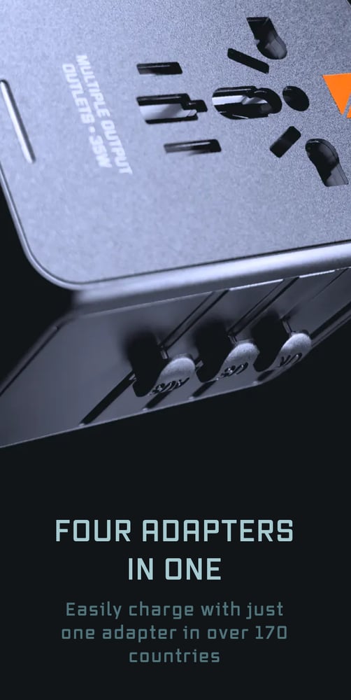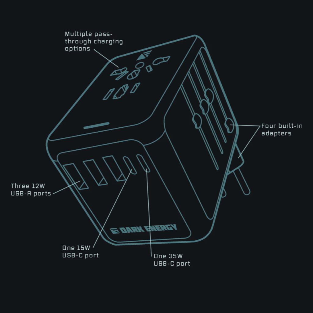 The Dark Energy Int'l Wall Adapter is the ultimate travel charging solution. With four adapters in one, it allows you to charge your devices in over 170 countries. Designed for versatility and convenience, this powerful adapter features five charging ports, ensuring you can keep all your devices powered up on the go. From smartphones to tablets and even larger devices, this adapter can handle it all while offering pass-through charging so you never lose a wall outlet.