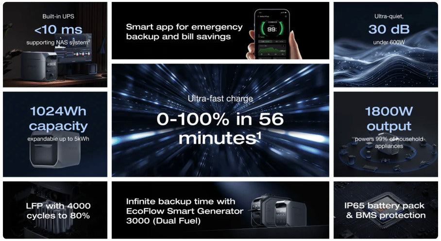 - Expandable Capacity: 1024Wh base, expandable up to 5kWh using compatible EcoFlow Extra Batteries (DELTA 3, Pro 3, 2 Max, or 2 EB).