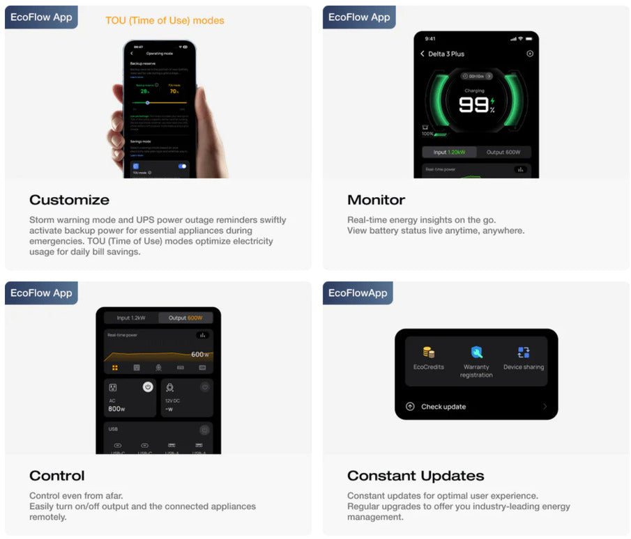 - Smart Controls: Connect via the EcoFlow app for Time-of-Use scheduling and storm alerts.