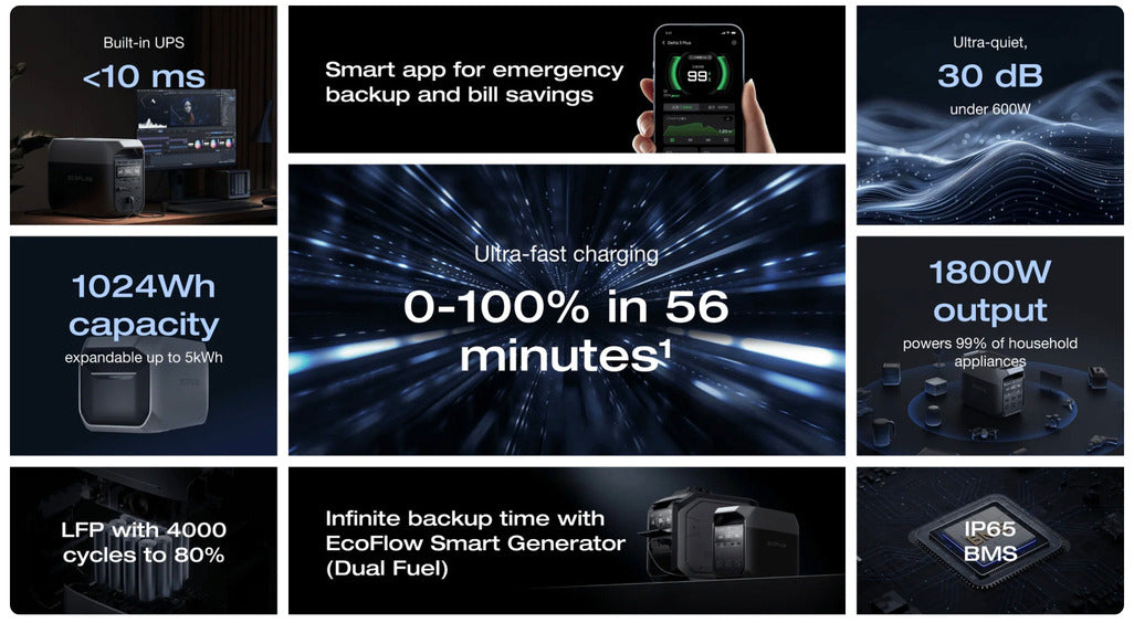 - Expandable Capacity: Scale from 1kWh up to 5kWh with compatible EcoFlow Extra Batteries (DELTA 3, DELTA Pro 3, DELTA 2, DELTA 2 Max).