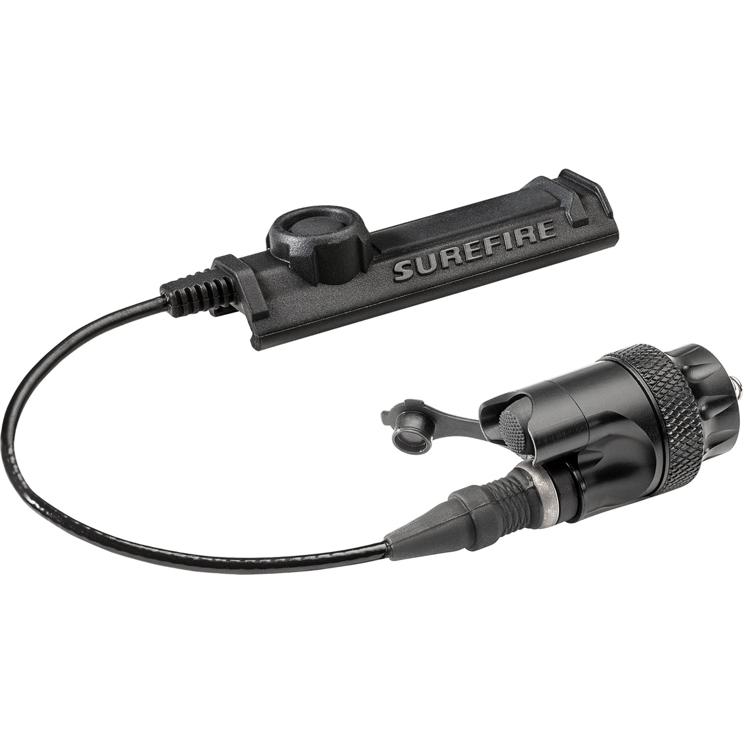 The SureFire DS-SR07 Waterproof Switch Assembly is engineered for dependable control of Scout Light® WeaponLights (excluding Micro Scout Light Pro) under demanding conditions. This dual-function switch assembly includes a click-on/off push-button switch and a 7-inch remote tape switch, offering both momentary-on and click-on/off activation. The push-button and remote tape switch operate independently, providing redundancy and versatility in light activation. Its rugged, O-ring-sealed housing ensures weatherproof performance, making it ideal for tactical scenarios.