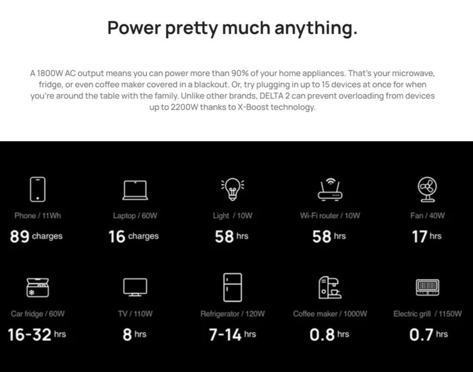 - High Output Power: 1800W AC output (2200W peak with X-Boost) powers 90% of household appliances