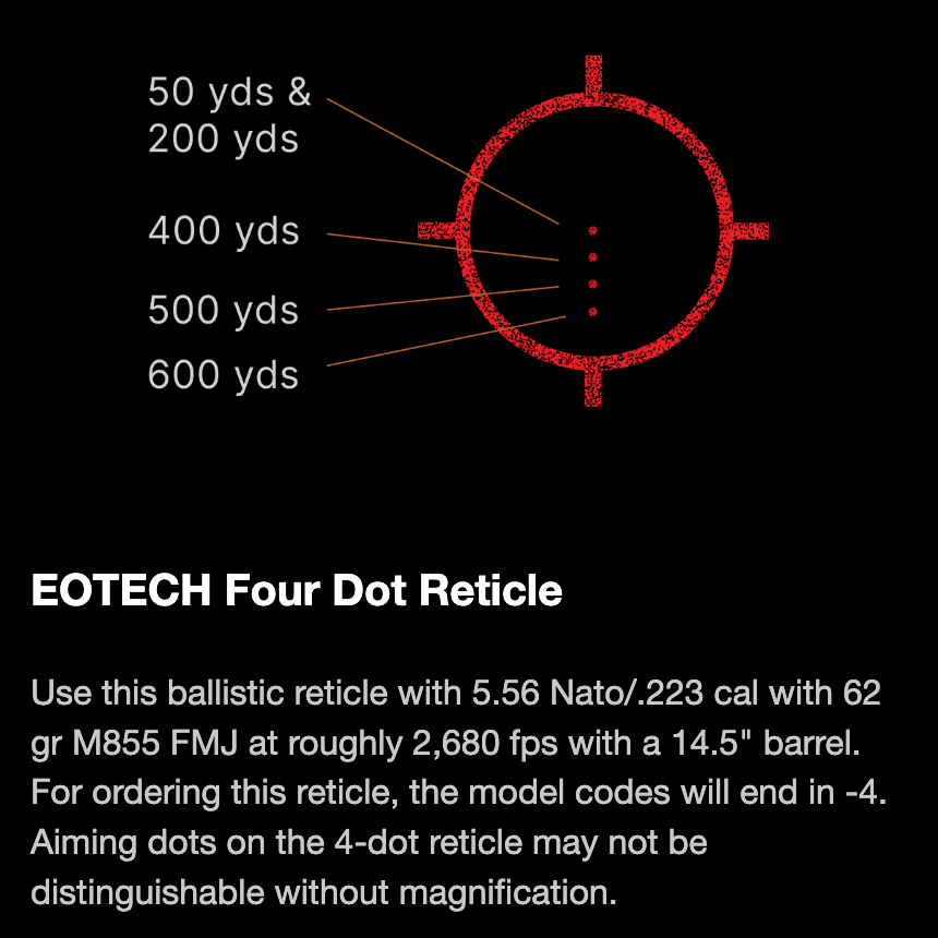 Four Dot Reticle (-4 models): Designed for 5.56 NATO/.223 caliber with 62 gr M855 FMJ at approximately 2,680 fps and a 14.5" barrel. Ideal for ranging and targeting at multiple distances. Aiming dots may not be visible without magnification.