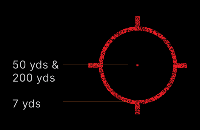 Our most popular reticle offered, the 68 MOA ring with 1 MOA dot provides three usable aiming points. The aiming points above are based on the following load: .223 cal. 62 gr. 2,900 vel. When using other loads and calibers, the opera- tor will have to establish the ranges associated with the aiming points. When using a shotgun, the 68 MOA ring can be used to represent shot patterns but will vary based on choke and shell selection. For ordering this reticle, the model codes will end in -0.