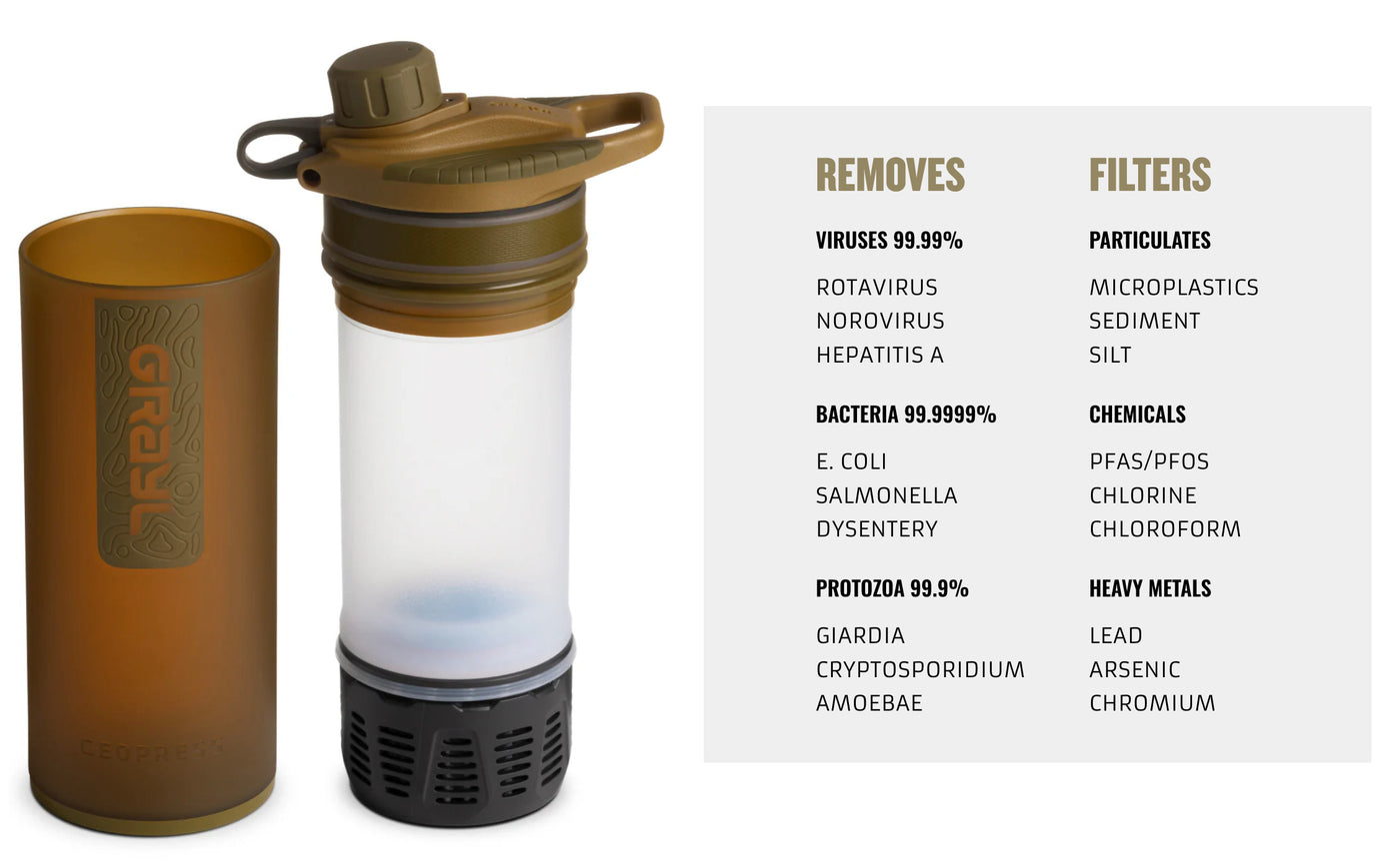 Purify. Filter. Cook. Take on any challenge with our flagship 24oz GeoPress® Ti Purifier Bottle. Made from CP4 Grade 1 Titanium, it is a functional masterpiece and fits perfectly into any pack pocket. Filter and purify at virtually any freshwater source, then bring it back to camp for cooking clean water over a stove or open flame. Meticulously crafted with the expertise of industry professionals, this bottle is the ultimate tool for adventure and performance.