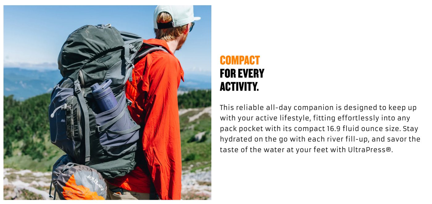 Compact, fun, and ridiculously easy to use — the 16.9oz UltraPress® Purifier Bottle fits into any pack pocket (or cup holder), requires zero setup, and makes clean, great tasting drinking water in a mere 10 seconds (3L/min). On-the-go filtration and purification for the hiker, backpacker, camper, emergency prepper or global traveler seeking fast-flow purified water for chugging, filling hydration reservoirs, or cooking.
