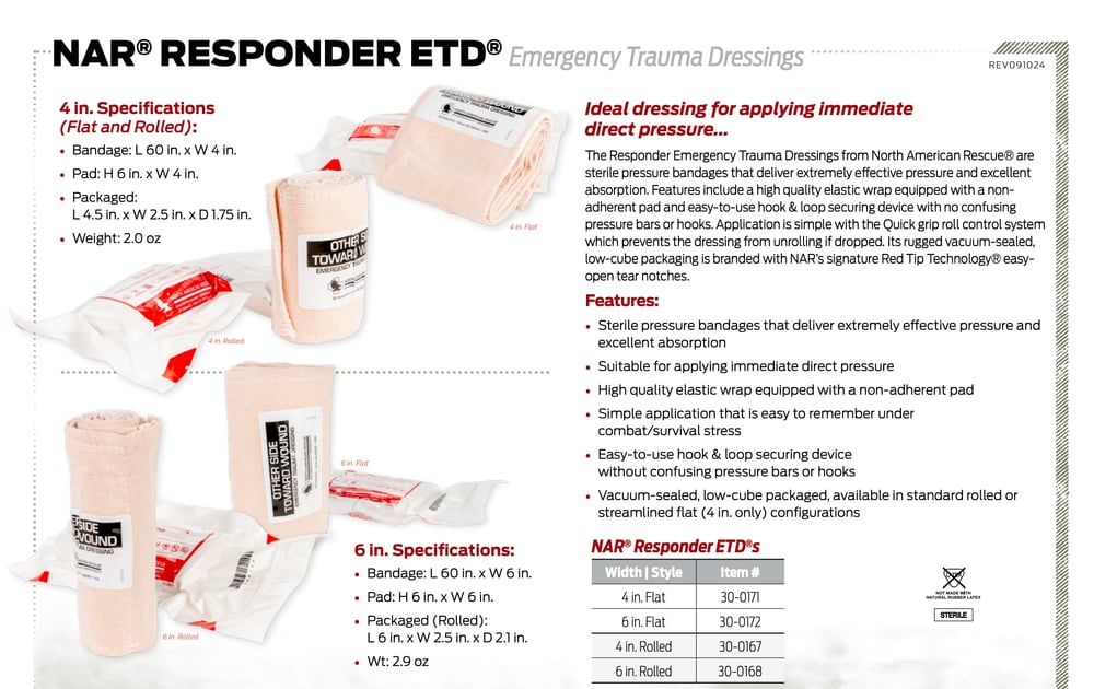This 4-inch rolled version features a high-quality elastic wrap with a non-adherent pad, a hook & loop securing device that eliminates confusing pressure bars or hooks, and Quick-Grip™ Roll Control to prevent accidental unrolling. Vacuum-sealed in a low-cube, durable package with NAR's Red Tip Technology® tear notches, it ensures quick access when every second counts.