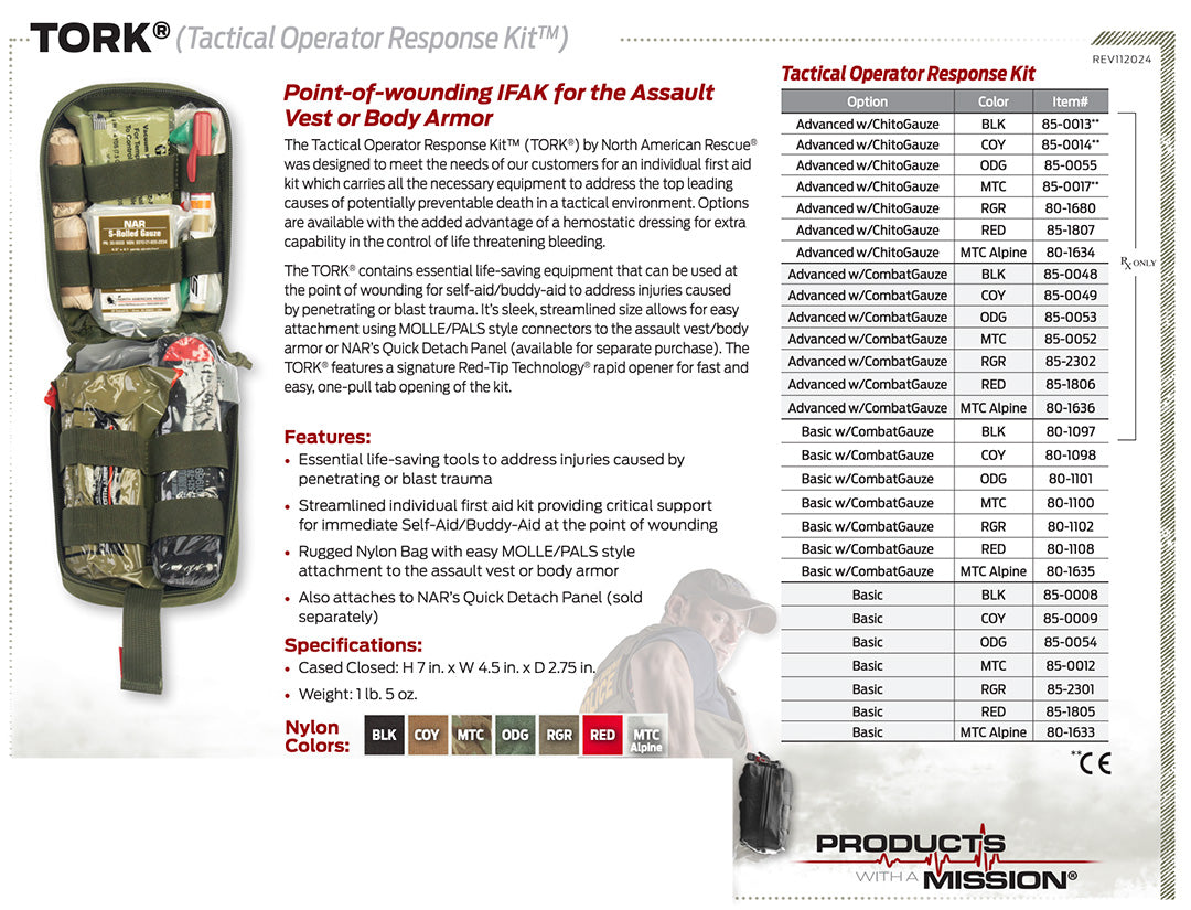 The North American Rescue Tactical Operator Response Kit® (T.O.R.K.) is an individual first aid kit engineered for rapid deployment in tactical environments. Designed to address the most common preventable causes of death in combat and high-threat situations, the T.O.R.K. provides essential life-saving tools for immediate Self-Aid and Buddy-Aid after penetrating or blast trauma.