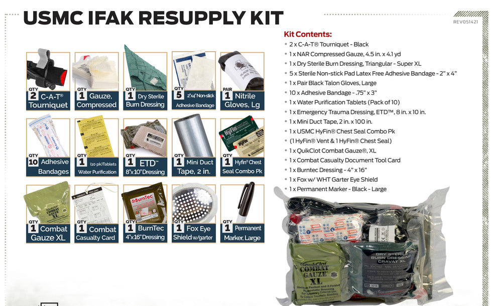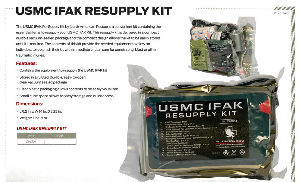 The North American Rescue USMC IFAK Resupply Kit is a compact, vacuum-sealed package containing essential medical components to fully replenish a standard USMC Individual First Aid Kit. Designed for combat readiness and emergency preparedness, this resupply kit equips you to treat penetrating, blast, or other traumatic injuries in the field.