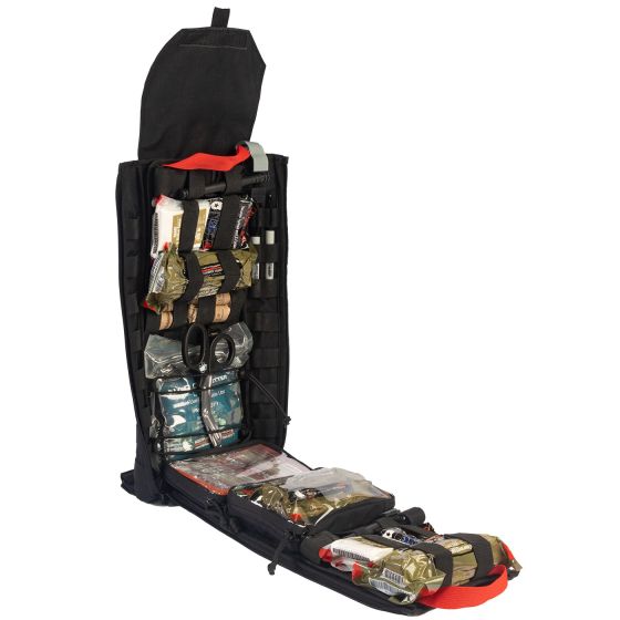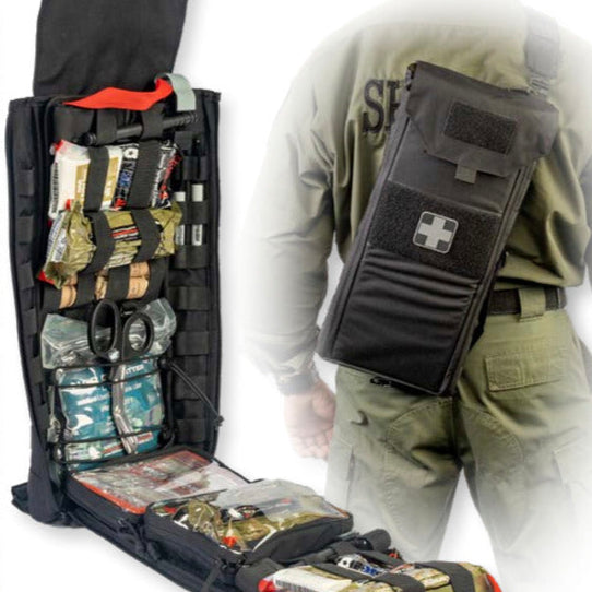 Its versatile design allows it to be worn with a single bandolier-style sling or a detachable waist strap for hands-free mobility. Inside, the kit includes two tear-away IFAK panels, two clear accessory pouches, and an internal shock cord panel for securing a compact soft litter or other mission-critical equipment. External MOLLE webbing makes it easy to attach tourniquet pouches, while a large ID patch panel ensures fast recognition in chaotic situations.