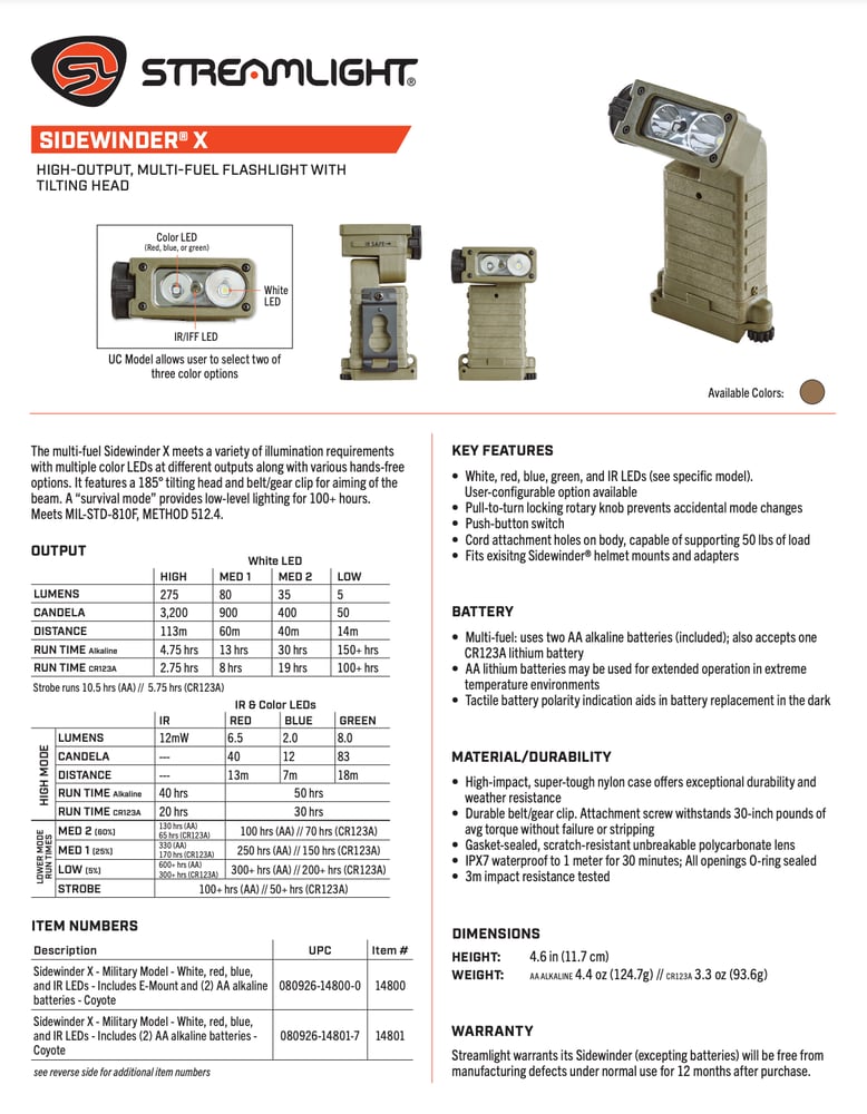 The Sidewinder® X is a high-output, right-angle, multi-fuel light built for military personnel and professionals requiring versatile and durable illumination. Its 185° tilting head and multiple LED options make it ideal for diverse tasks in demanding environments.