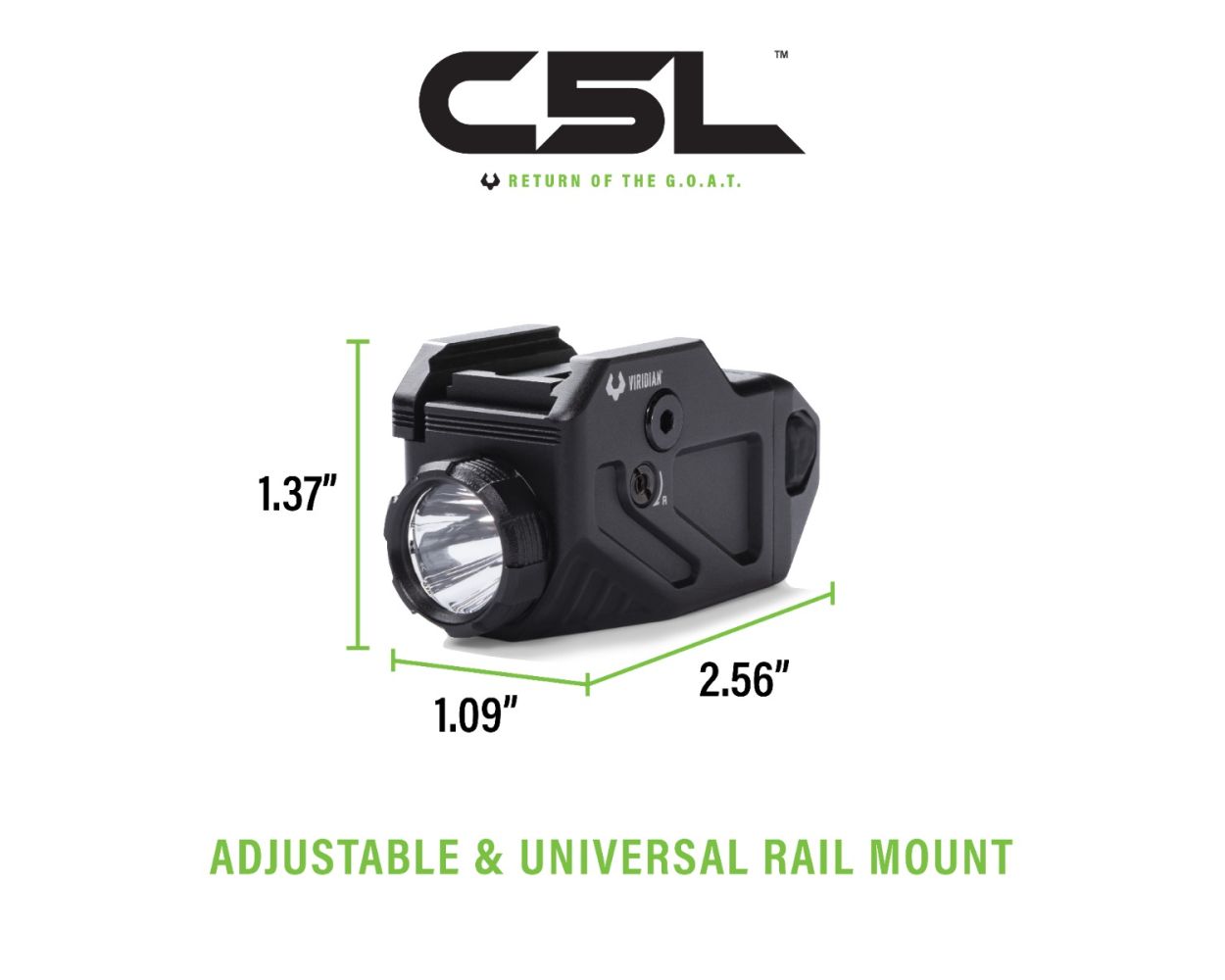 The C5L has a universal mount and is ideal for small to medium framed railed firearms. Fits on guns such as Sig P365-XMacro, Taurus G3C/G2C, S&W Shield 2.0 EZ, S&W Equalizer, Hellcat & Hellcat Pro, Taurus TX22 Compact, etc. The C5L fits medium to full framed railed firearms and is at home on guns such as Glock 17/19/22/23/45, Sig P320, S&W M&P, Beretta 92XI, Taurus G3, Walther PDP, etc.