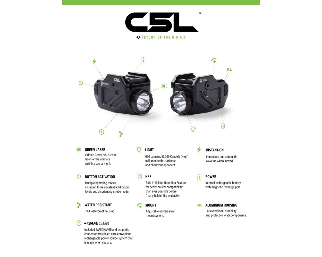 The C5L started it all – as the first ever compact green laser sight and light. Others followed but the C5L was always the original and the benchmark. The all-new C5L is better than ever and loaded with features making it the leader of the pack once again. Maintaining a small footprint, it packs in the industry-leading features you expect from Viridian such as the legendary patented INSTANT-ONtech. Introducing SafeCharge, the gotta-have ultraconvenient rechargeable power source system ready when you are. Also new is the HRFthebuilt-in Holster Retention Feature for better holster compatibility than ever possible before.