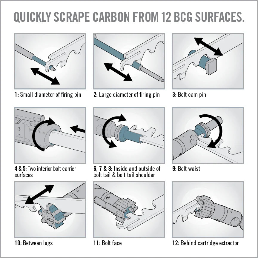 - Includes the AR15 Scraper™ for cleaning 12 BCG surfaces