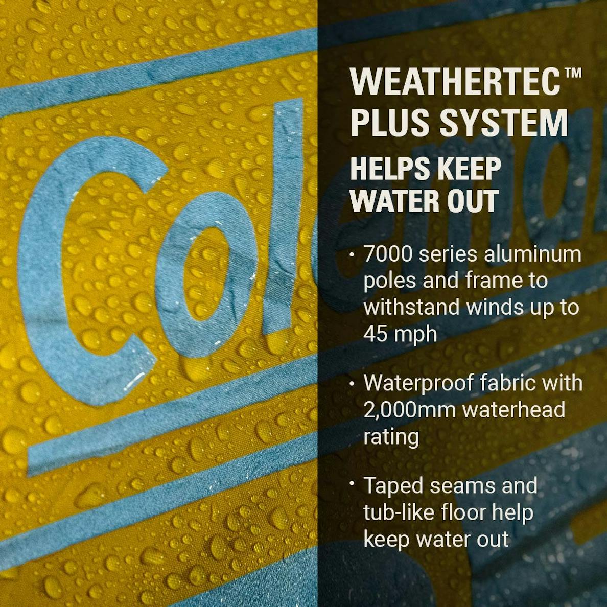 - WeatherTec™ Plus System: Waterproof fabric (2,000mm rating), taped seams, tub floor, and 7000 series aluminum poles withstand winds up to 45 mph