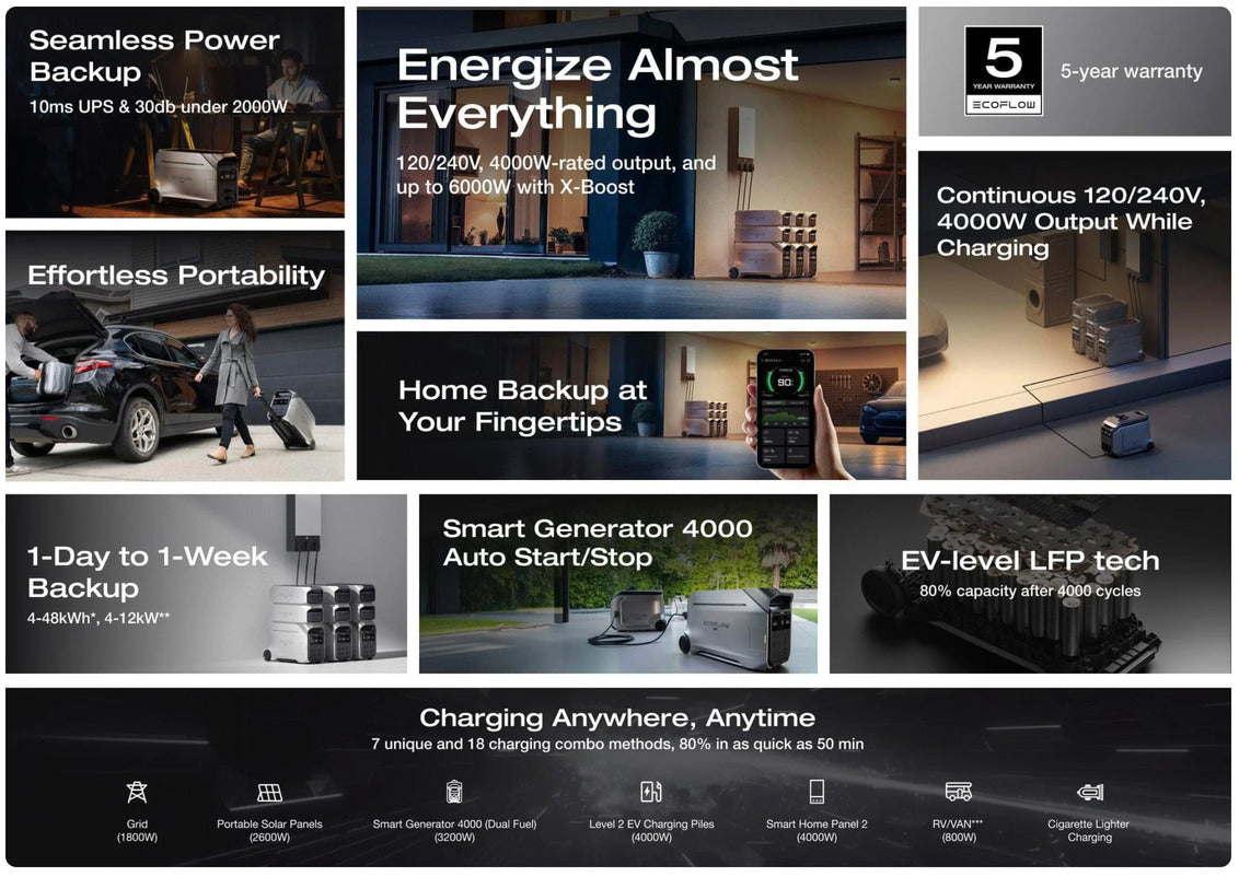 - Massive 4000W Output (6000W X-Boost): Handle high-demand appliances with ease, including refrigerators, HVAC, and power tools.