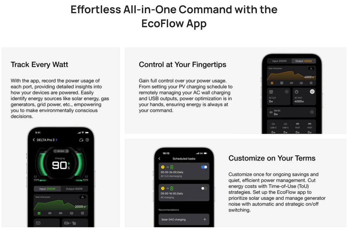 - Smart App Control: Monitor and control charging, discharging, circuit usage, and more from anywhere via the EcoFlow app.