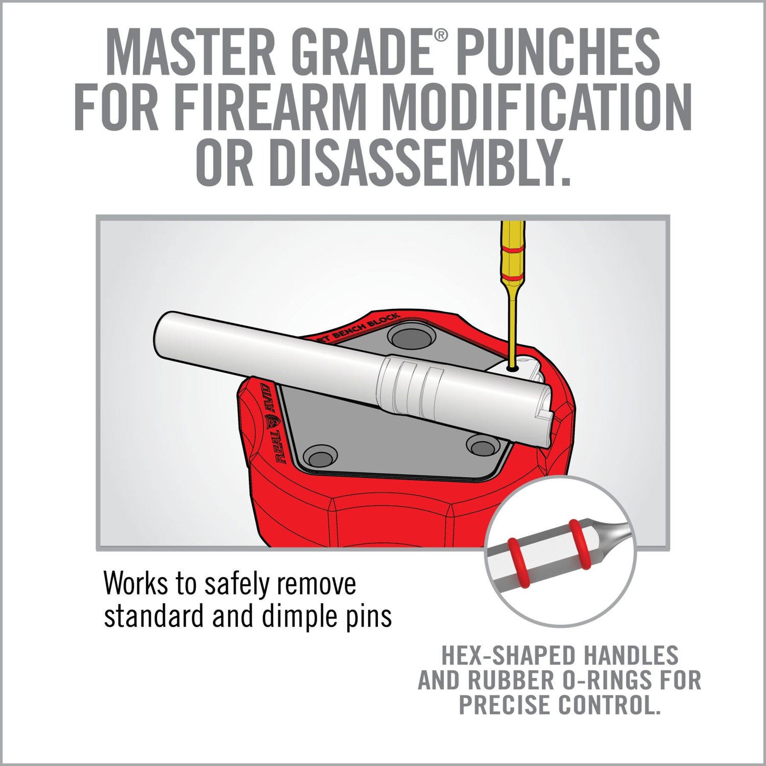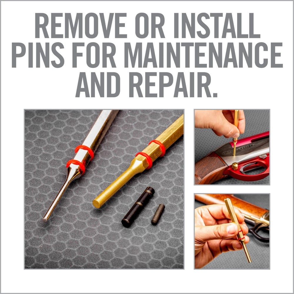 The ACCU-PUNCH® 11-Piece Standard Brass & Steel Pin Punch Set is an essential collection of gunsmithing tools designed for modifying and disassembling firearms. This set includes the most frequently used pin punches, made from brass and hardened steel, with a nickel plating to resist corrosion. Each punch features a hex-shaped handle and rubber O-rings for enhanced grip and precise control, ensuring accuracy and ease of use.