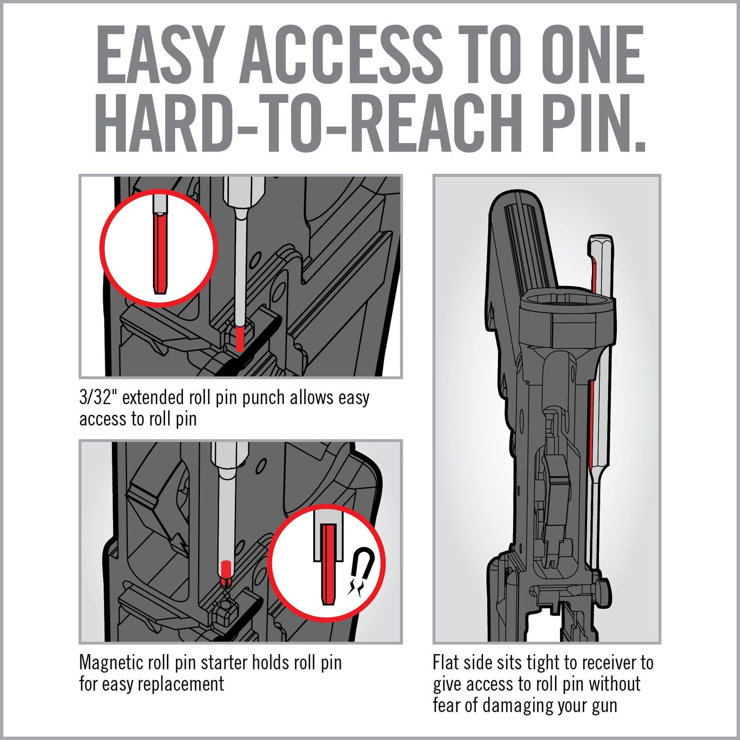 - Includes a roll pin punch for removing pins