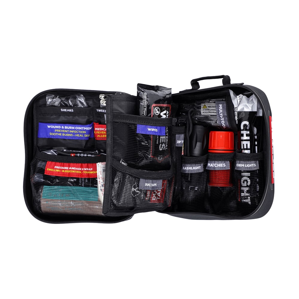 - Survival Tools Included: Comes with a flashlight, chem lights, multi-tool, stormproof matches, and duct tape for additional utility in emergency situations.