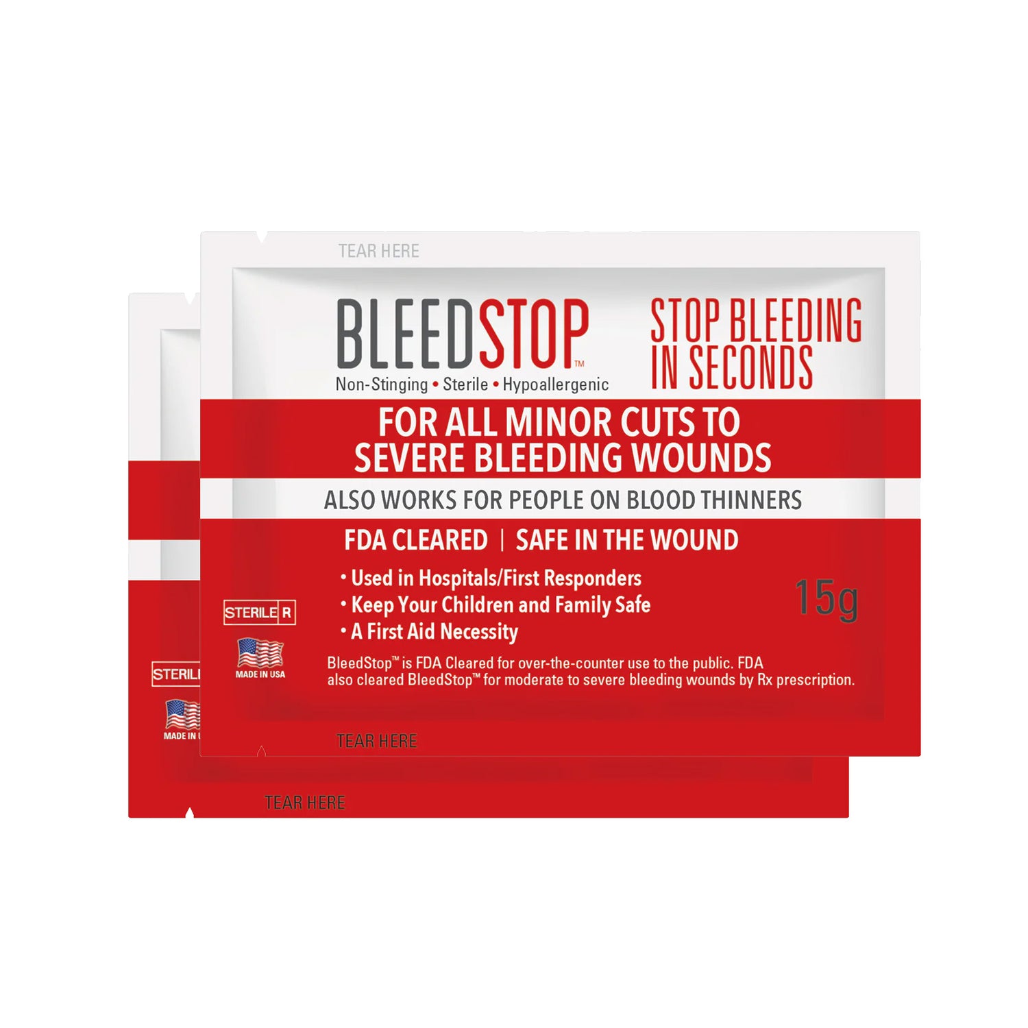 Non-stinging. Sterile. Hypoallergenic. Stop bleeding in seconds. For minor cuts to large bleeding wounds. Also works for people on blood thinners. Safe in the wound. Used by hospitals & first responders. Keep your children and family safe. A first aid necessity. Be prepared. Clinically proven. Contains four single use packets. BleedStop is FDA cleared for over-the-counter use to the public. FDA also cleared BleedStop for moderate to severe bleeding wounds by Rx prescription. Great for everyday use.