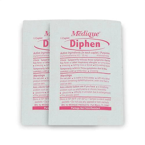 - 2 DIPHEN PACKETS - Used to relieve symptoms of allergy, hay fever, and the common cold.