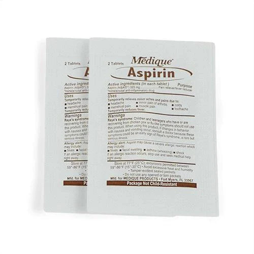 - 2 ASPIRIN PACKETS - Aspirin is a common drug for relieving minor aches, pains, and fevers. Also can be used as a anti-inflammatory or a blood thinner.