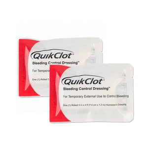 The QuikClot® Bleeding Control Dressing fills the need for an OTC hemostatic dressing for home emergencies as well as professional first responders and medical personnel. The bleeding Control Dressing combines surgical gauze with Kaolin, a proprietary inorganic material that accelerates the body’s natural clotting process and stops venous and arterial bleeding within minutes of application. QuikClot devices do not contain any animal, human, plant or shellfish materials so there is no worry of initiating an allergic response. Kaolin produces no exothermic reaction so there is no burn! The soft, pliable nature of gauze conforms readily to the wound site, won’t break down, and can be easily removed once clotting has occurred. The rugged, easy-tear pouch provides durability and quick access when needed. This rolled dressing is sized for small-medium injuries.