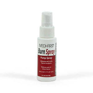 - Medi-First® Burn Spray provides fast, anesthetic treatment for minor burns, sunburn, scalds and abrasions.
