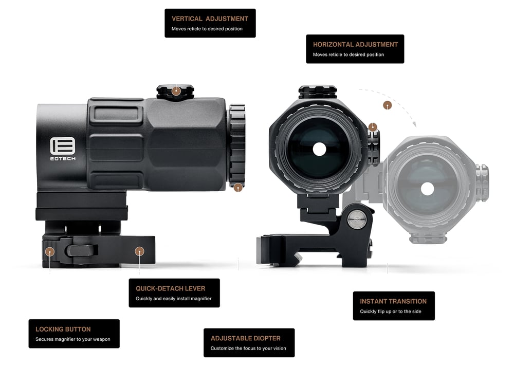 The EOTech G45 is a compact, operator-grade 5X magnifier designed to extend the precision and range of your holographic weapon sight without sacrificing speed or field-of-view. Building on the popular G33 platform, the G45 offers the same lightweight footprint with an upgraded 5X magnification for enhanced medium-range accuracy. The included Switch-to-Side (STS) mount enables rapid transitions from 5X to 1X targeting, making it ideal for dynamic tactical environments.
