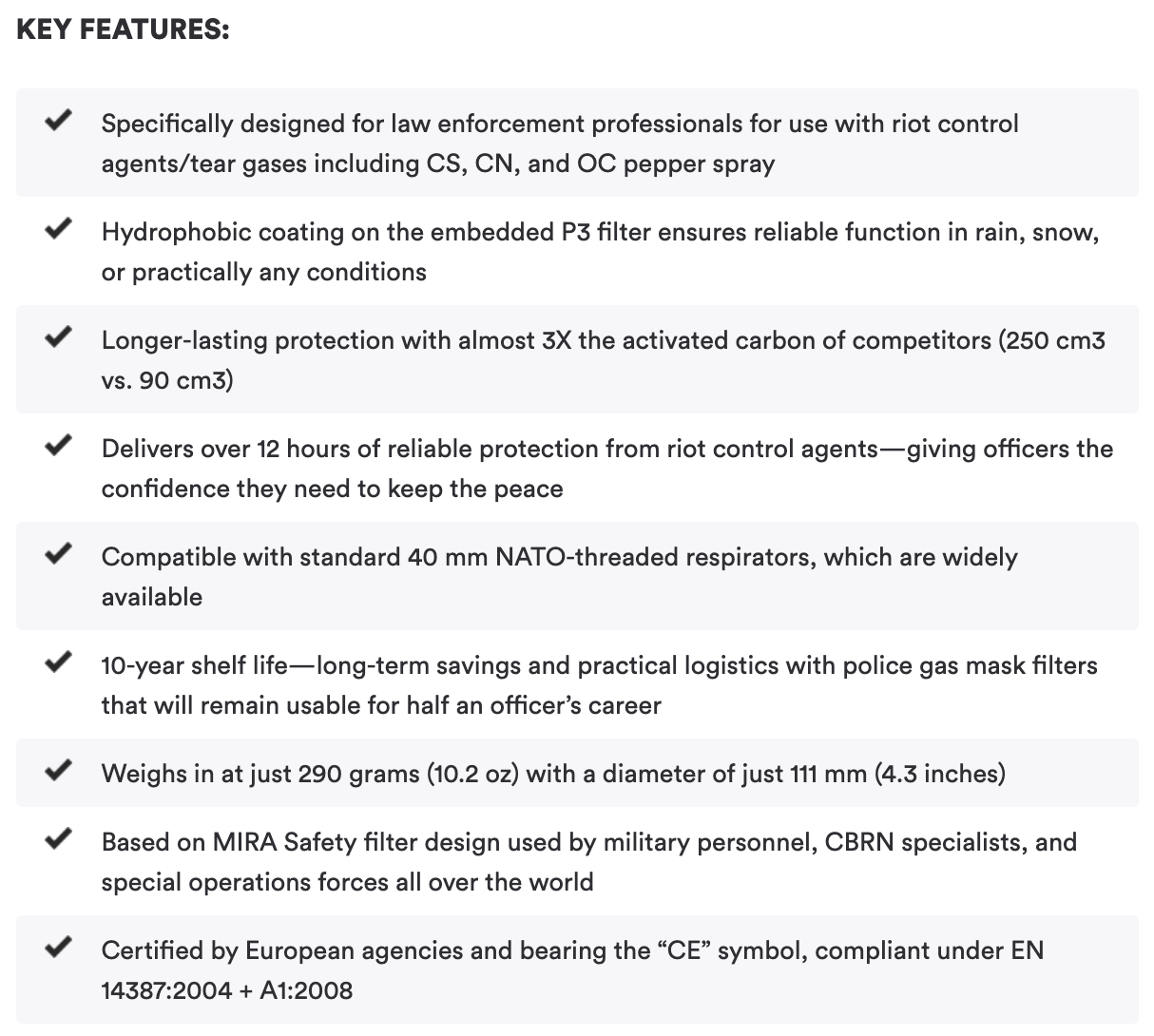 The MIRA Safety P-CAN police gas mask filter is one of the world’s most advanced solutions for potential long-term exposure to riot control gasses including CS, CN, and OC.