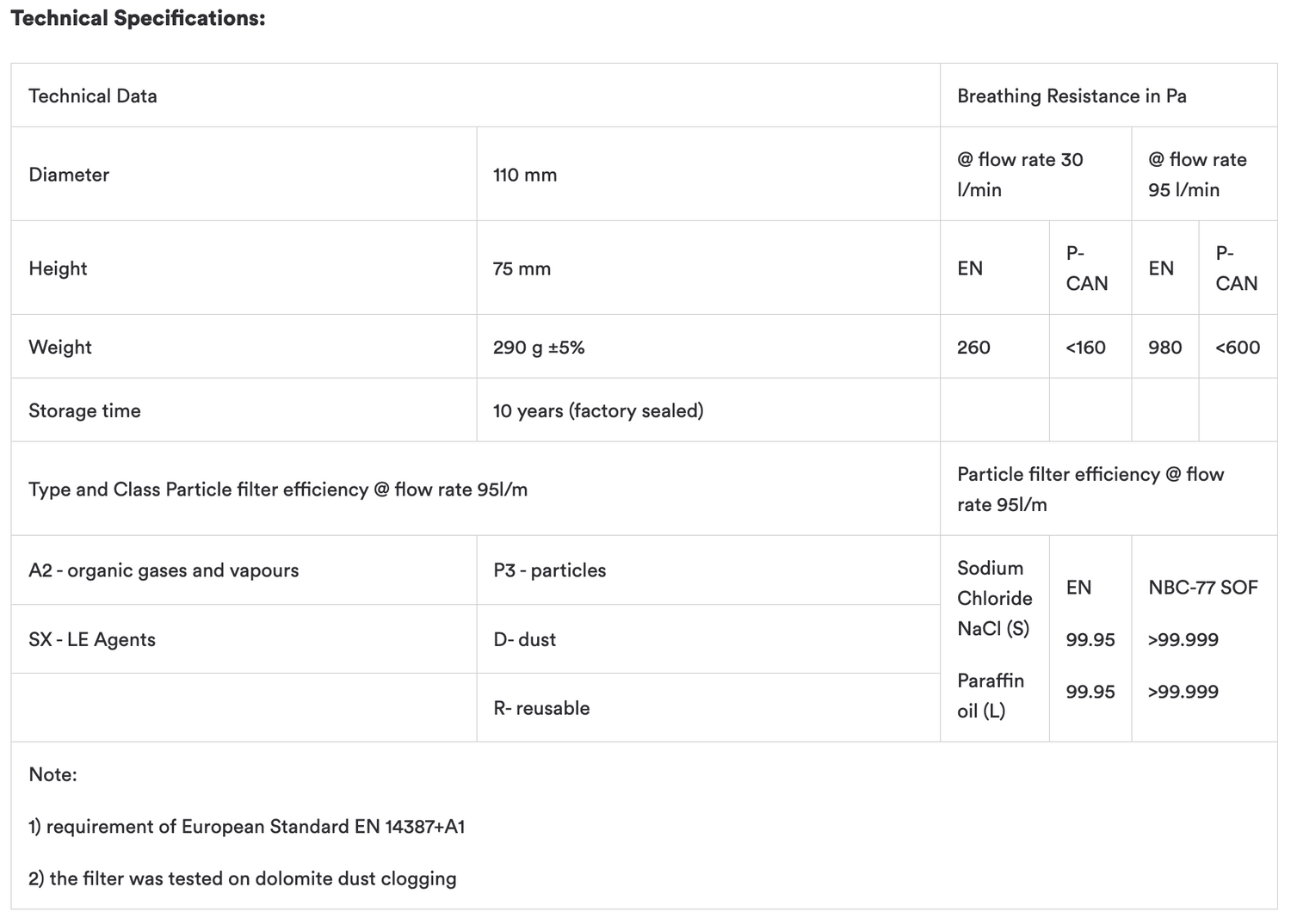 The filters are produced with standard round threads according to STANAG 4155 (EN 148-1)- Rd 40 x 1/7". In addition to a shelf life of almost double than competing filters, they also meet EN 14387:2004 + A1:2008 standards for the removal of CS/CN gas in vapor form. Individual canisters are vacuum-sealed, dated, and black in color for easy identification in inventory.