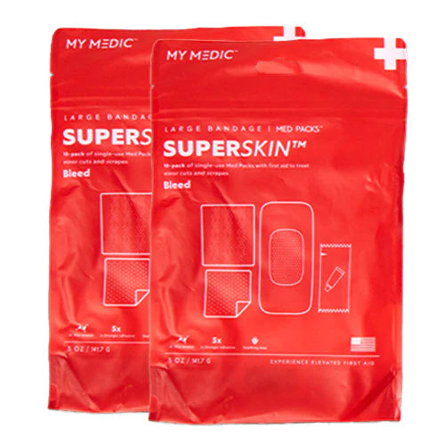 - 2 SINGLE-USE 2"X4" BANDAGE PACKS - Each Pack contains: 1 2"x4" SuperSkin Bandage, 1 Antiseptic Towelette, 1 Triple Antibiotic, 1 2"x2" Gauze Pad