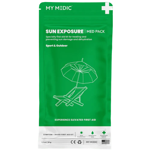 - SUN EXPOSURE MED PACK - Pack Contains: 3 Sunscreen sachets, 1 Lip Balm, 2 Kokos Hydration Sticks, 2 Ibuprofen packets, 1 APAP packet