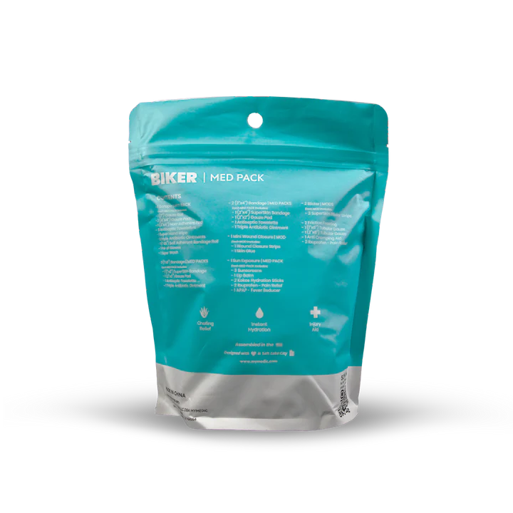 Whether you're a seasoned cyclist or a beginner, you won't want to leave this Med Pack behind. The Biker Med Pack's specialized supplies are intentionally chosen by riders and medical professionals to treat common injuries like road rash and blisters. You will have everything you need to be prepared and enjoy the ride!