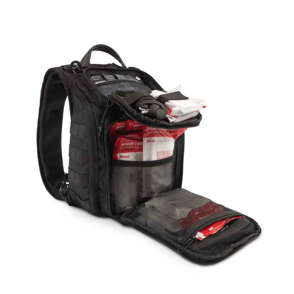 - Trauma & Bleeding Control: Central panel for tourniquets, gauze, and seals