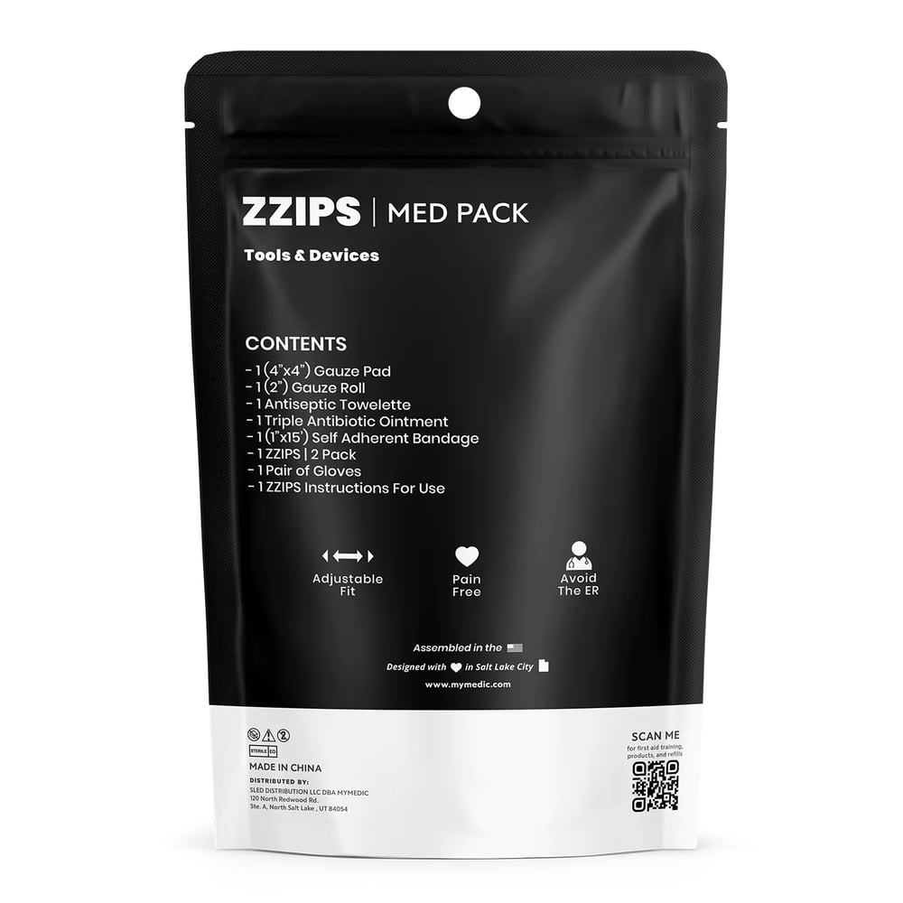 The revolutionary alternative to common sutures and stitches. The ZZIPS MedPack is a compact and portable all-in-one First Aid solution to treat cuts and lacerations where traditional sutures would be needed.
