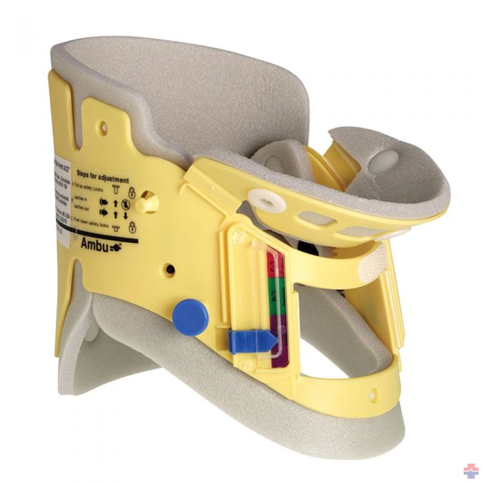 Ambu perfit ACE Pediatric extrication cervical collar is the only adjustable one-piece rigid cervical spine immobilization device with 12 precise settings for a customized fit within the range of 3 standard pediatric settings. The Ambu Perfit ACE comes with a comprehensive sizing system for easy and accurate sizing. The Ambu Perfit ACE extrication collar comes with a flip chin piece for flat storage and preshape to fit the chin, and to facilitate intubation and removal of vomitus from the patient's mouth. The Perfit ACE incorporates latches which allow the rescuer to size the collar according to the victim's exact neck size. Two safety buttons hold the collar in place for maximum reliability.