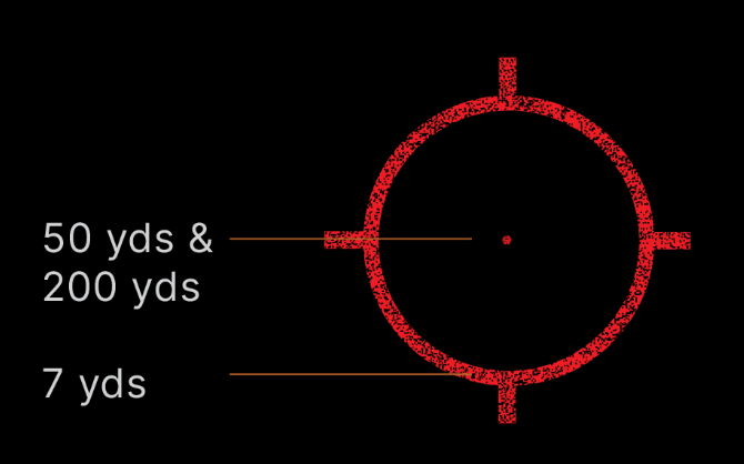 Our most popular reticle offered, the 68 MOA ring with 1 MOA dot provides three usable aiming points. The aiming points above are based on the following load: .223 cal. 62 gr. 2,900 vel. When using other loads and calibers, the opera- tor will have to establish the ranges associated with the aiming points. When using a shotgun, the 68 MOA ring can be used to represent shot patterns but will vary based on choke and shell selection. For ordering this reticle, the model codes will end in -0.