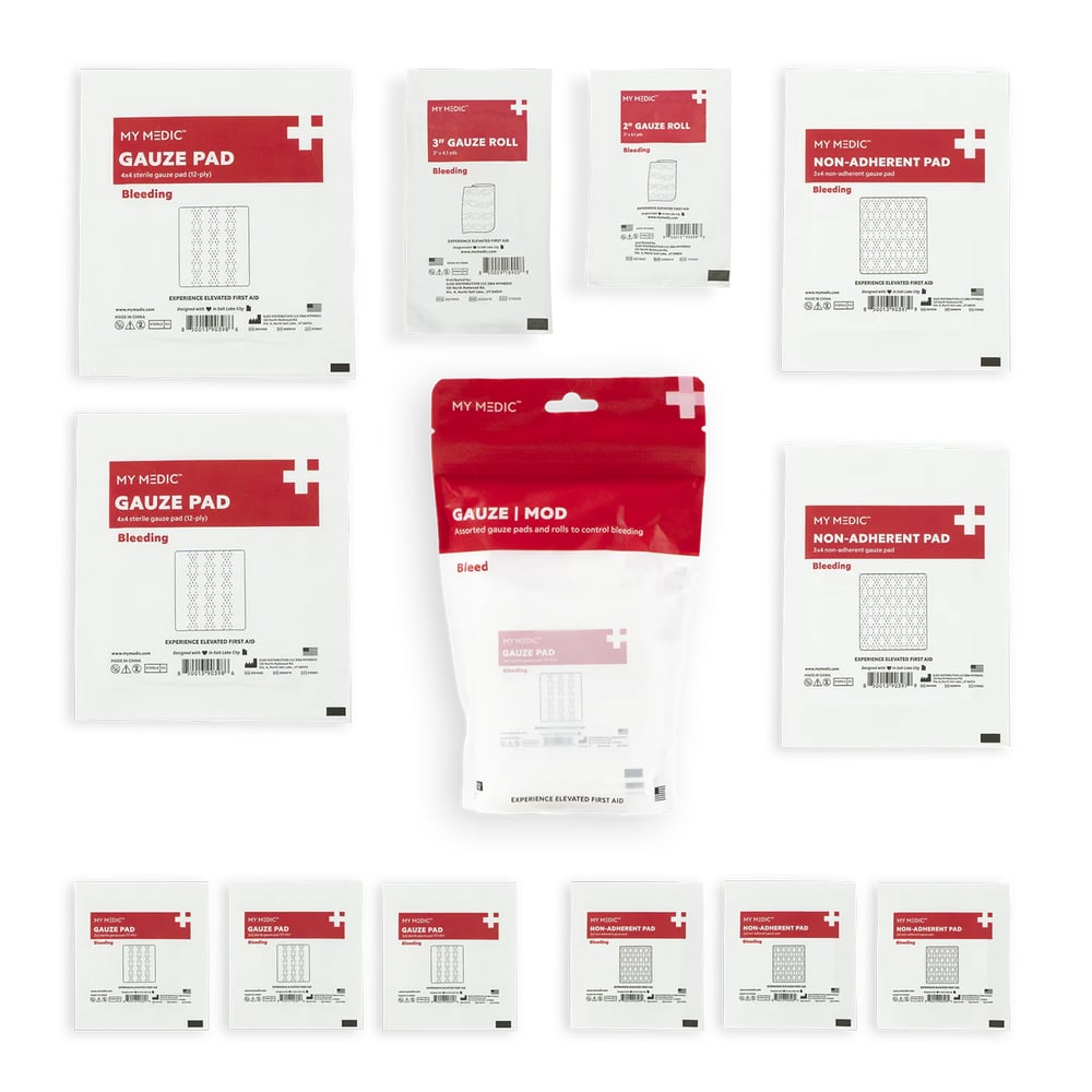 Assorted gauze pads and rolls to control bleeding. Our MOD system is the perfect solution to re-stock or upgrade your My Medic First Aid Kit.