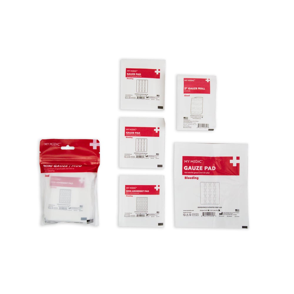 Mini assortment of gauze pads and rolls to control bleeding. Our MOD system is the perfect solution to re-stock or upgrade your My Medic First Aid Kit.